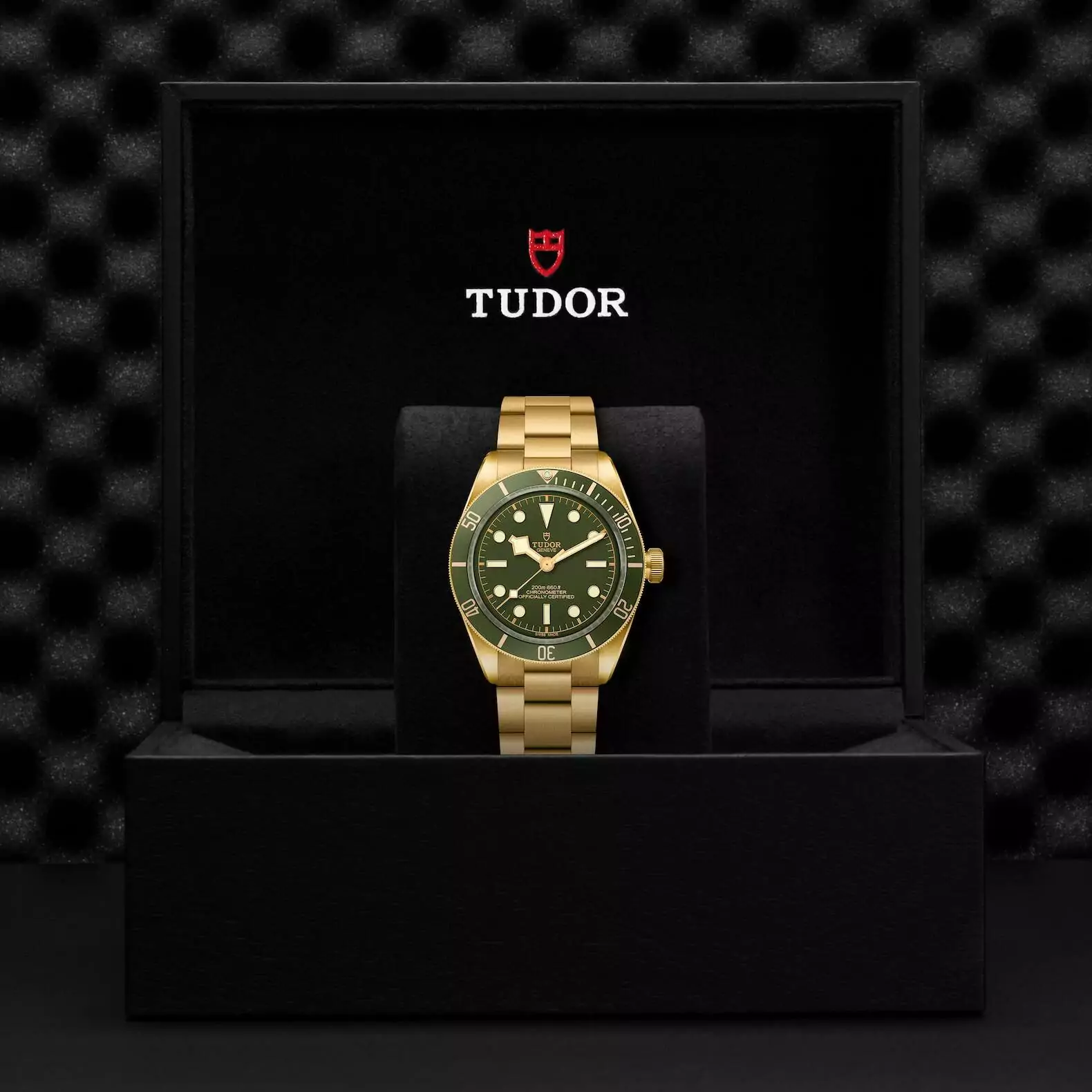 • Mechanische Uhr von Tudor mit Gehäuse und Band aus 18 Karat Gelbgold, 39 mm Durchmesser, COSC-zertifiziertes Manufakturkaliber mit Automatikaufzug, 70 Stunden Gangreserve, auf Dichtheit geprüft bis 20 ATM, Saphirglasboden und in eine Richtung drehbare Lünette.