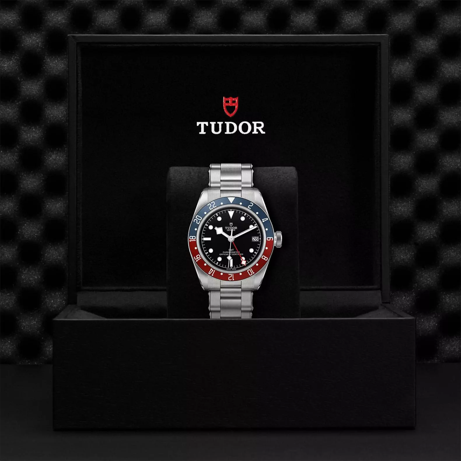 • Mechanische Uhr von Tudor mit Gehäuse und Band aus Edelstahl, 41 mm Durchmesser, COSC-zertifiziertes Manufakturkaliber mit Automatikaufzug, 70 Stunden Gangreserve, auf Dichtheit geprüft bis 20 ATM, Datumsanzeige und in beide Richtungen drehbare Lünette zur Anzeige einer zweiten Zeitzone.