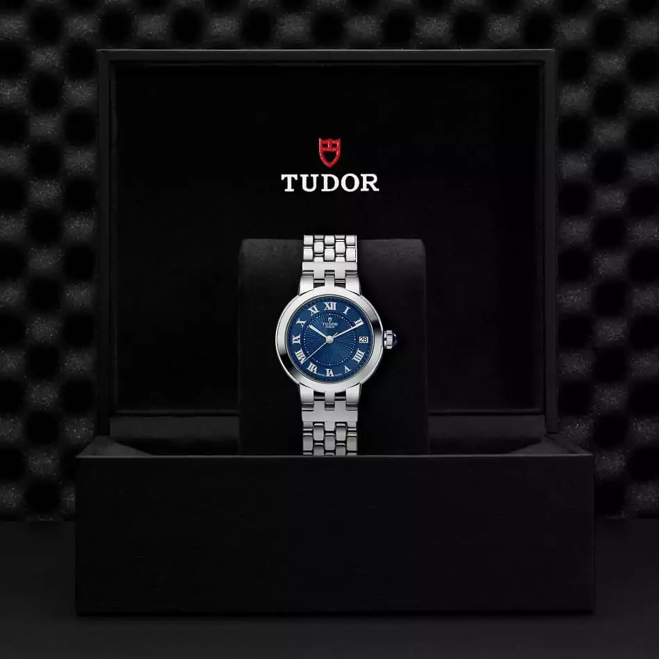 • Mechanische Uhr von Tudor mit Gehäuse und Band aus Edelstahl, 34 mm Durchmesser, Automatikwerk mit 38 Stunden Gangreserve, auf Dichtheit geprüft bis 10 ATM, verschraubte Krone mit Spinell-Cabochon und Datumsanzeige.