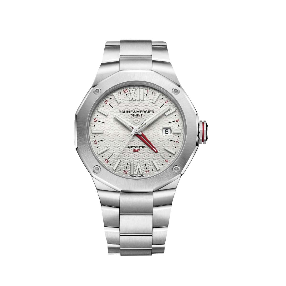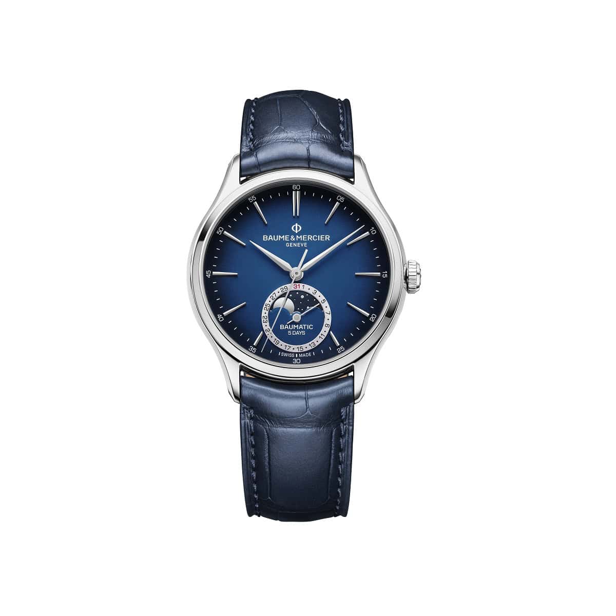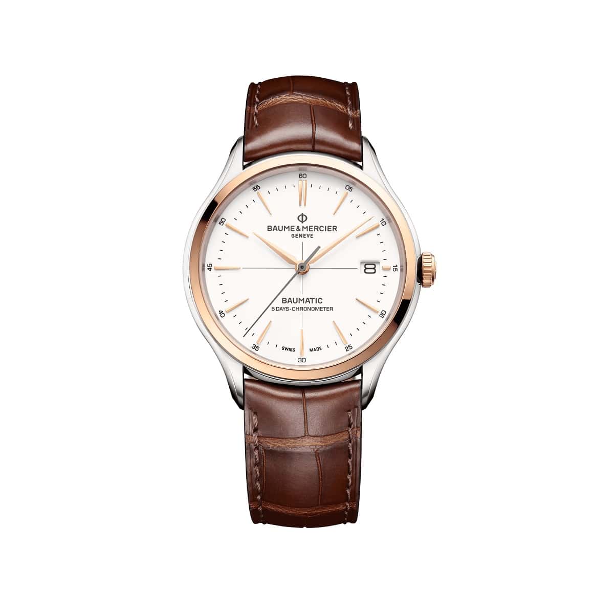 • Uhr von Baume & Mercier mit Edelstahlgehäuse und Lederband, Größe 43 mm x 27,5 mm, Quarzwerk, auf Dichtheit geprüft bis 5 ATM.