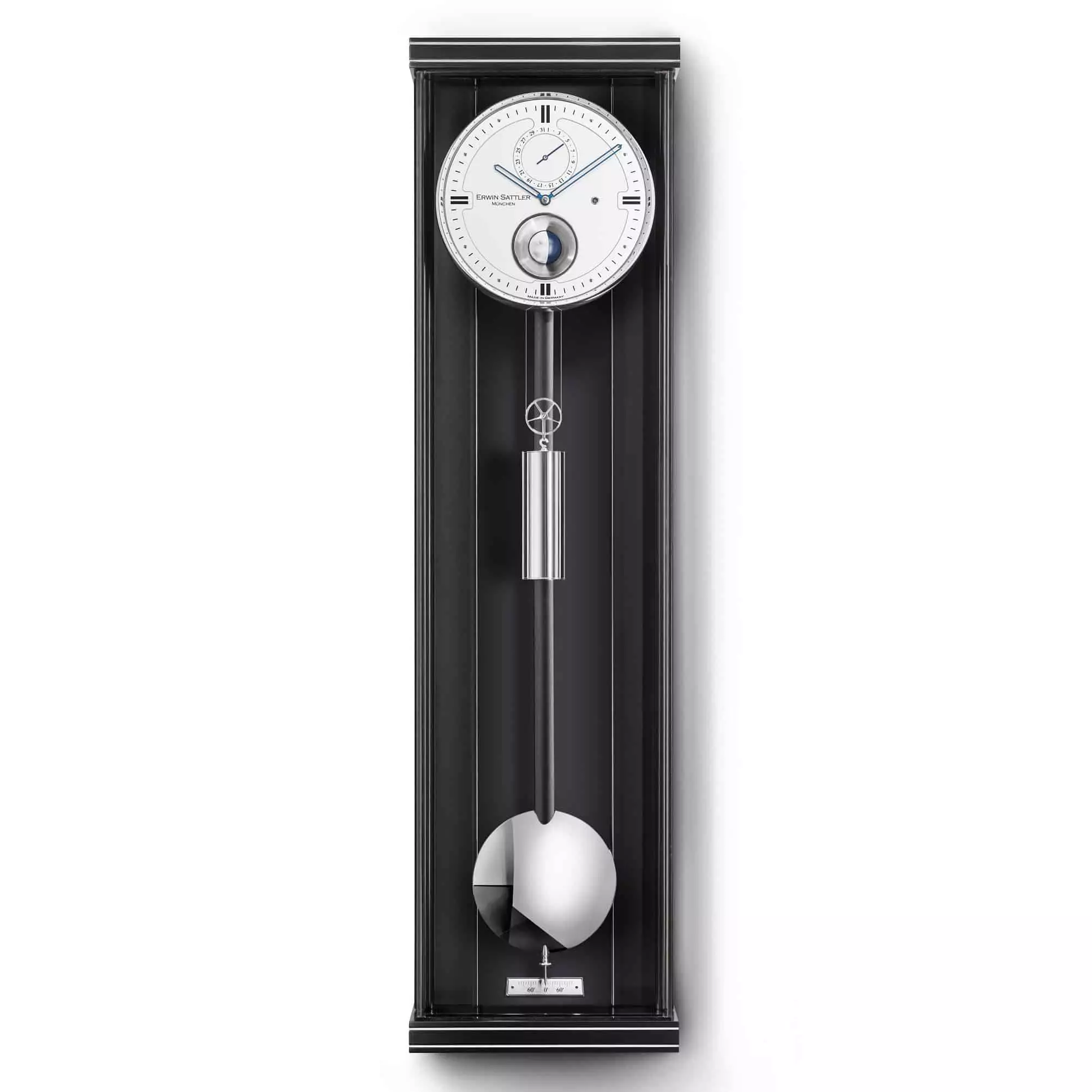 • Tischuhr von Erwin Sattler mit Gehäuse aus poliertem Nussholz sowie Holzsockel mit Metallintarsien und Fach zur Aufbewahrung des Aufzugschlüssels, dreiteiliges, naturfarben eloxiertes Zifferblatt, Höhe: 27,5 cm, Breite: 18,5 cm, Tiefe: 12 cm, Sattler Kaliber 1385 mit 15 Tage Gangdauer, Gangreserveanzeige, Datumsanzeige und kleine Sekunde