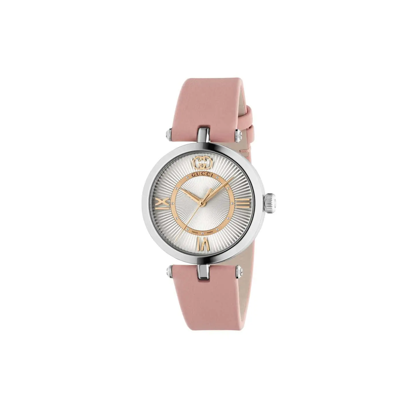 • Uhr von Gucci mit Edelstahlgehäuse und Lederband, 30 mm Durchmesser, Quarzwerk und auf Dichtheit geprüft bis 5 ATM.