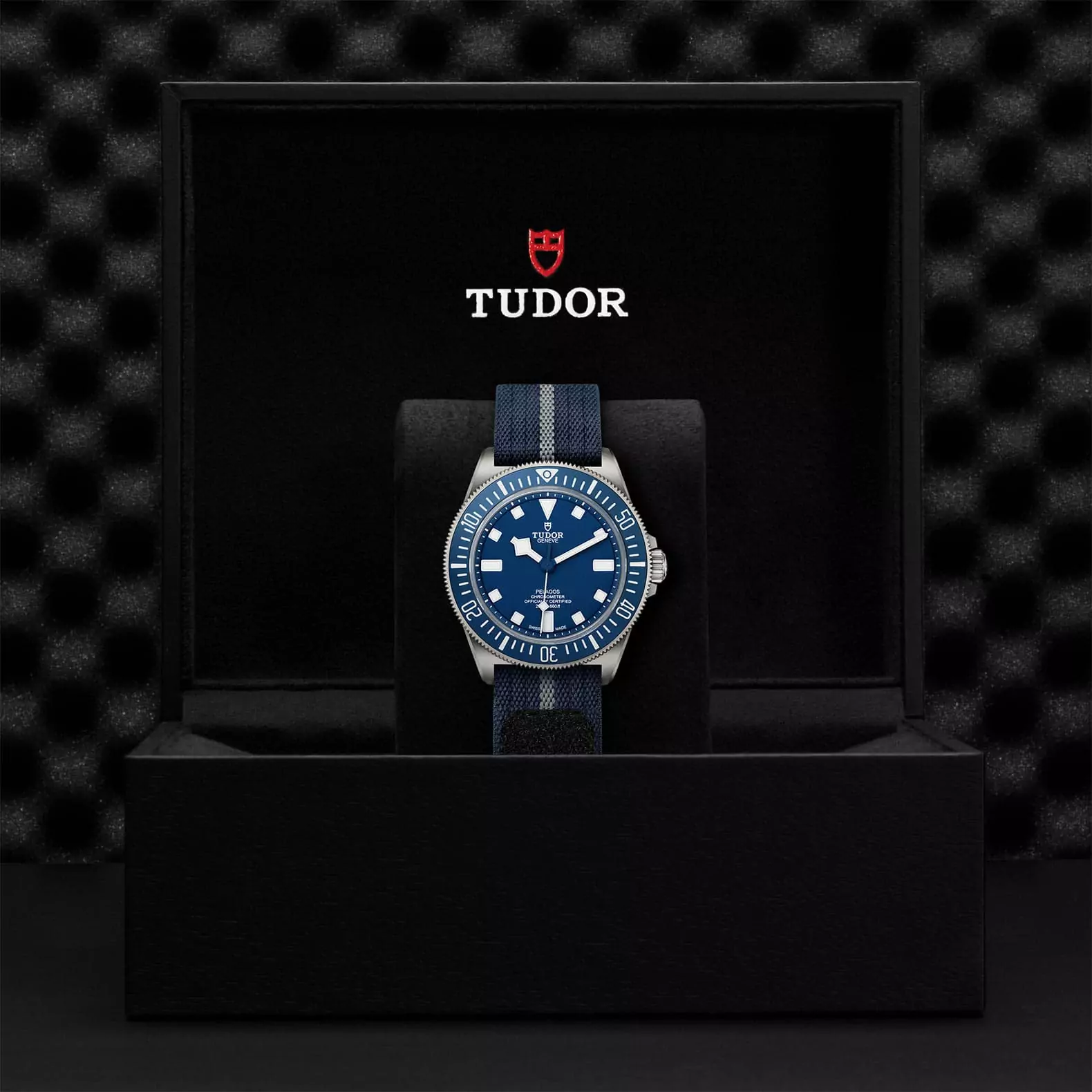 • Mechanische Uhr von Tudor mit Titangehäuse und Textilband sowie zusätzlichem Kautschukband, 42 mm Durchmesser, COSC-zertifiziertes Manufakturkaliber mit Automatikaufzug mit 70 Stunden Gangreserve, auf Dichtheit geprüft bis 20 ATM, in beide Richtungen drehbare Lünette mit retrograder 60-Minuten-Skalierung und Marine National Gravur auf der Rückseite.